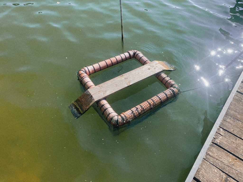 A napozócsapda működése:A csapda egy nagyon egyszerű lebegő napozófelület, aminek a középső területe hálóval van alulról fedve. A teknősök mivel hüllők, nagyon szeretik felmelegíteni a testüket, így létfontosságú számunkra a napozás, viszont tolatni nem szeretnek. Így ha a deszkára kimásznak napozni, amikor végeztek, vagy időközben megzavarja őket valami, akkor előre szaladva fognak fejest ugrani, így kerülnek a középső hálós zónába, ahol minden gond nélkül meg tudják várni a csapdát pár naponta ellenőrző önkéntest, aki mérések és fotódokumentáció után visszaengedi, vagy minket értesítve jó helyre küldi a kifogott példányokat.